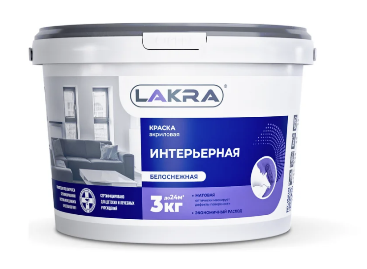Краска интерьерная акриловая Лакра белоснежная матовая, 3кг