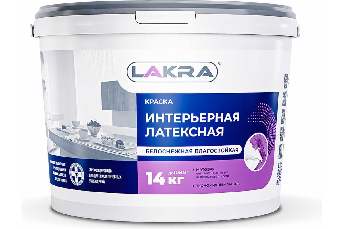 Краска интерьерная латексная влагостойкая Лакра белоснежная, 14кг (44шт/пал)